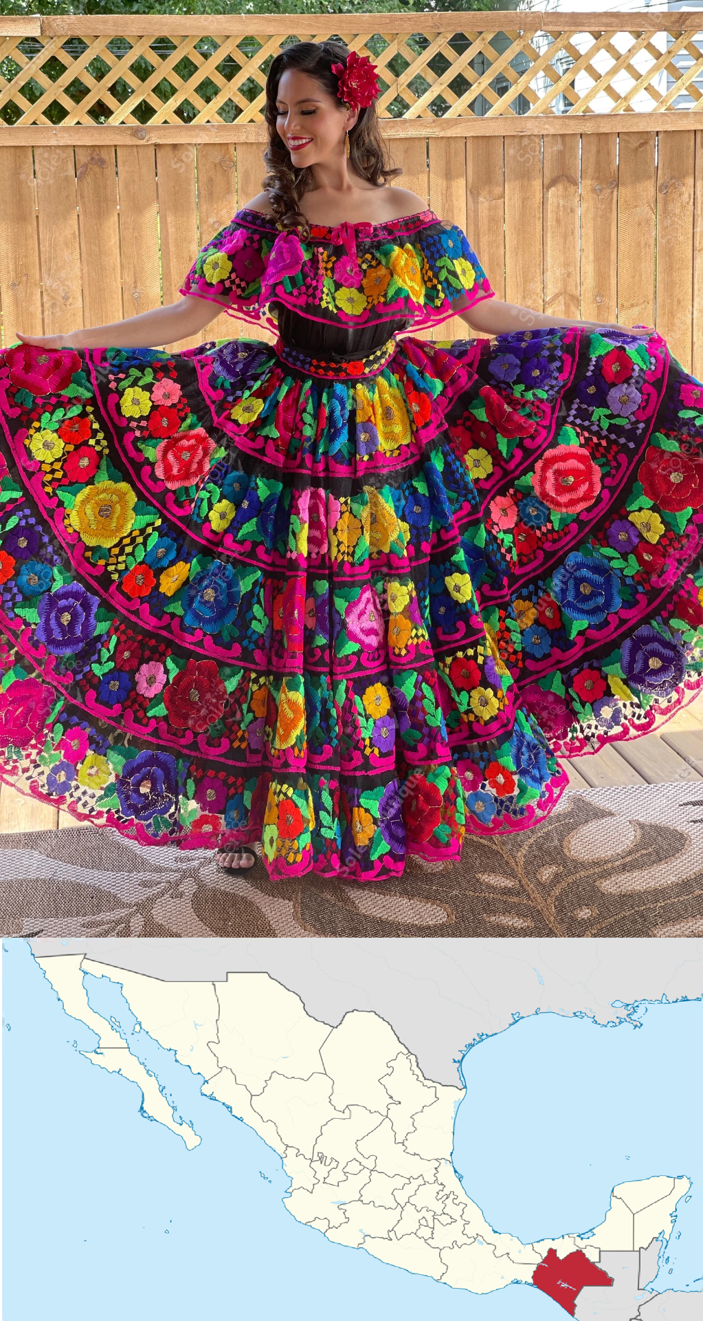 El vestido de chiapaneca es artesanía viva. Originario del estado de Chiapas, al sur de México, este vestido es uno de los más coloridos y tradicionales del país. Sobre tul negro, manos expertas bordan a mano flores grandes con hilo brillante; puntadas como petatillo dan relieve y luz. La falda circular se abre al moverse y la blusa, de hombros descubiertos, lleva un holán también bordado. Terminar un conjunto toma semanas y a veces meses: cada pétalo exige dibujo, bastidor y cientos de puntadas precisas. No es un simple atuendo; es un oficio concentrado en color y movimiento. Estas preciosas prendas son vestidos de gala, usados en la Fiesta Grande de Chiapa de Corzo y en presentaciones con marimba, desfiles y actos culturales.
